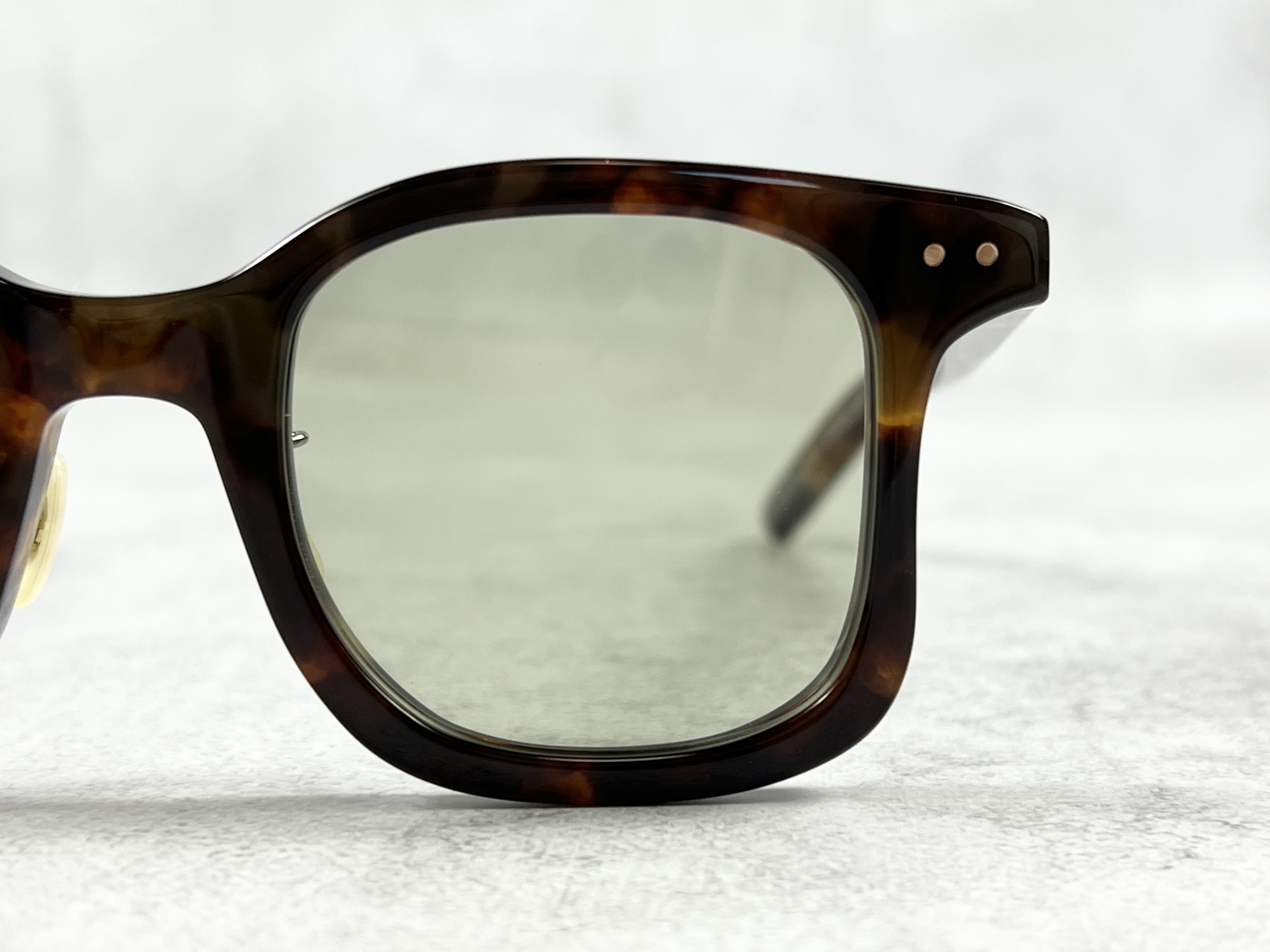 「ENALLOID」のフィルターを通しデイリーユースにのっとった色使い、タフな着用を実現するダブルピンのクリングスパーツに加え、恵那眼鏡が誇る磨きの美しさが際立つ6㎜厚のキューブ・テンプルを組み合わせてます。