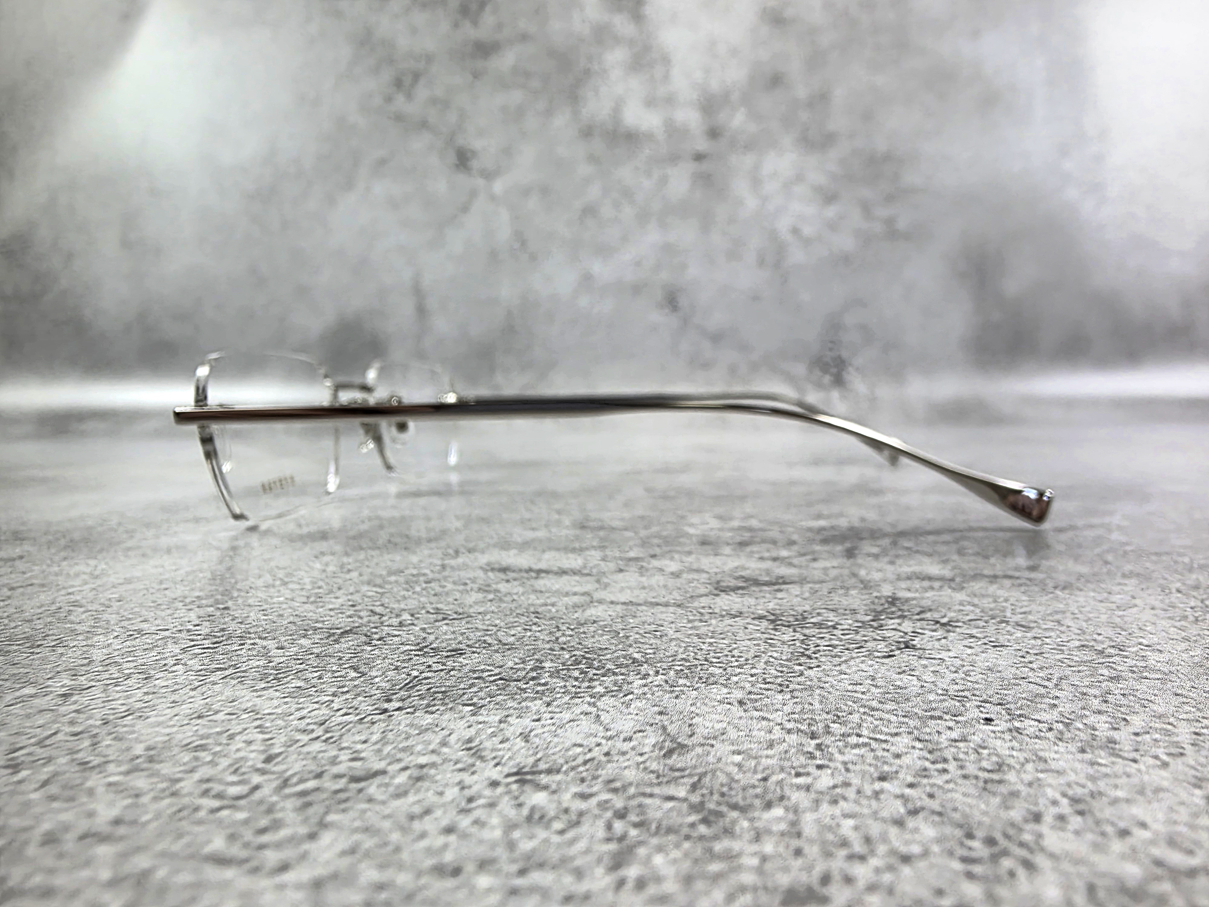 直線的なヨロイ形状が特徴のこのモデルは、1990年代のラグジュアリーブランドが着想源となったリムレスフレーム。上から見た丁番部の曲線をできるだけ最小限に抑えるため、0.1mm単位で開閉の設計を何度も行い、チタンブロックをプレスと複雑な削り出し によって製作。