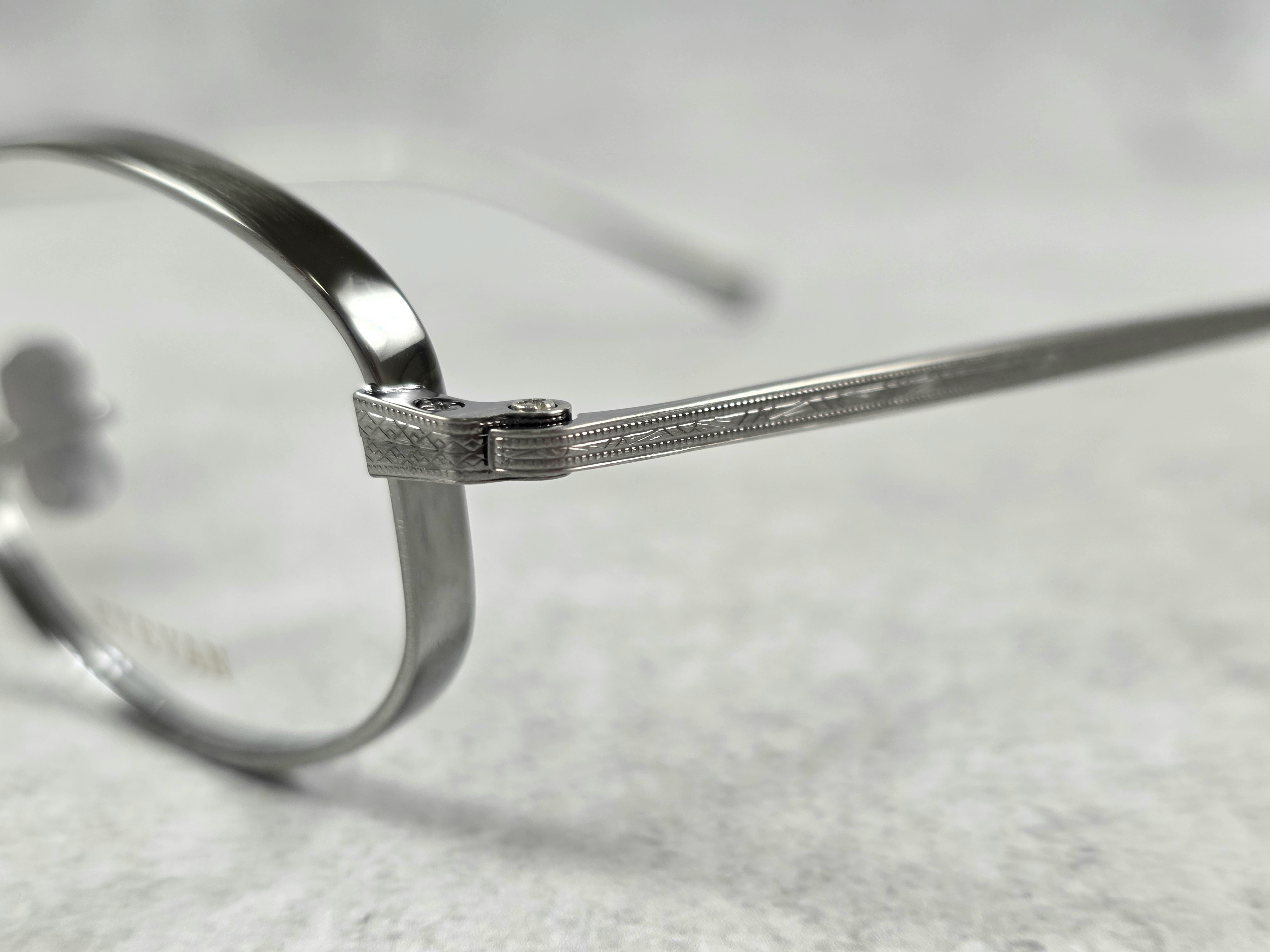 わずかに厚みをもたせたオリジナルリムに、丁番の内側にまで装飾が施された職人の手掘りマスターによるヨロイ、そして繊細な模様を刻んだチタンテンプルを組み合わせ、柔らかな曲線を描くブリッジで全体をまとめている。