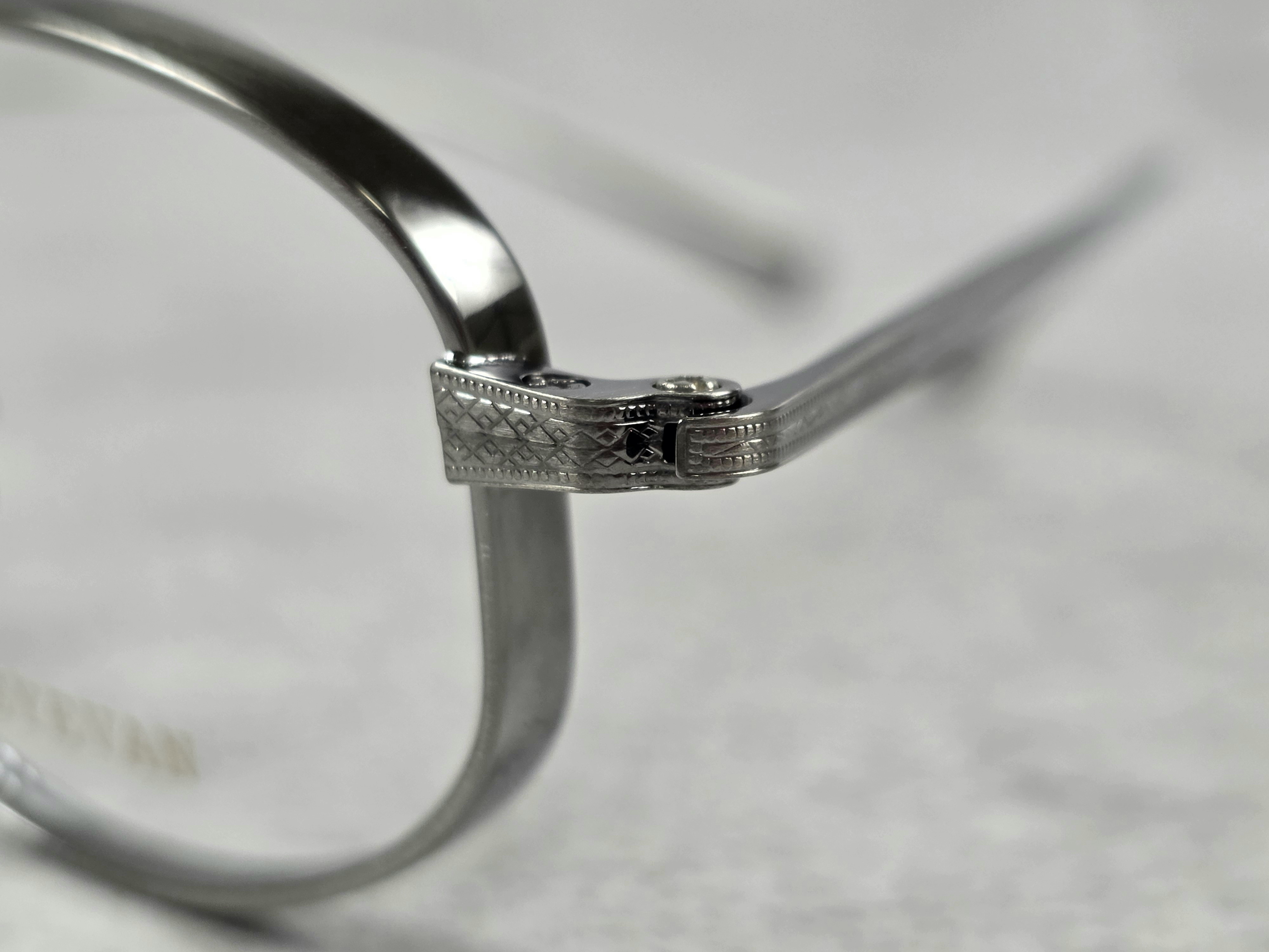 わずかに厚みをもたせたオリジナルリムに、丁番の内側にまで装飾が施された職人の手掘りマスターによるヨロイ、そして繊細な模様を刻んだチタンテンプルを組み合わせ、柔らかな曲線を描くブリッジで全体をまとめている。