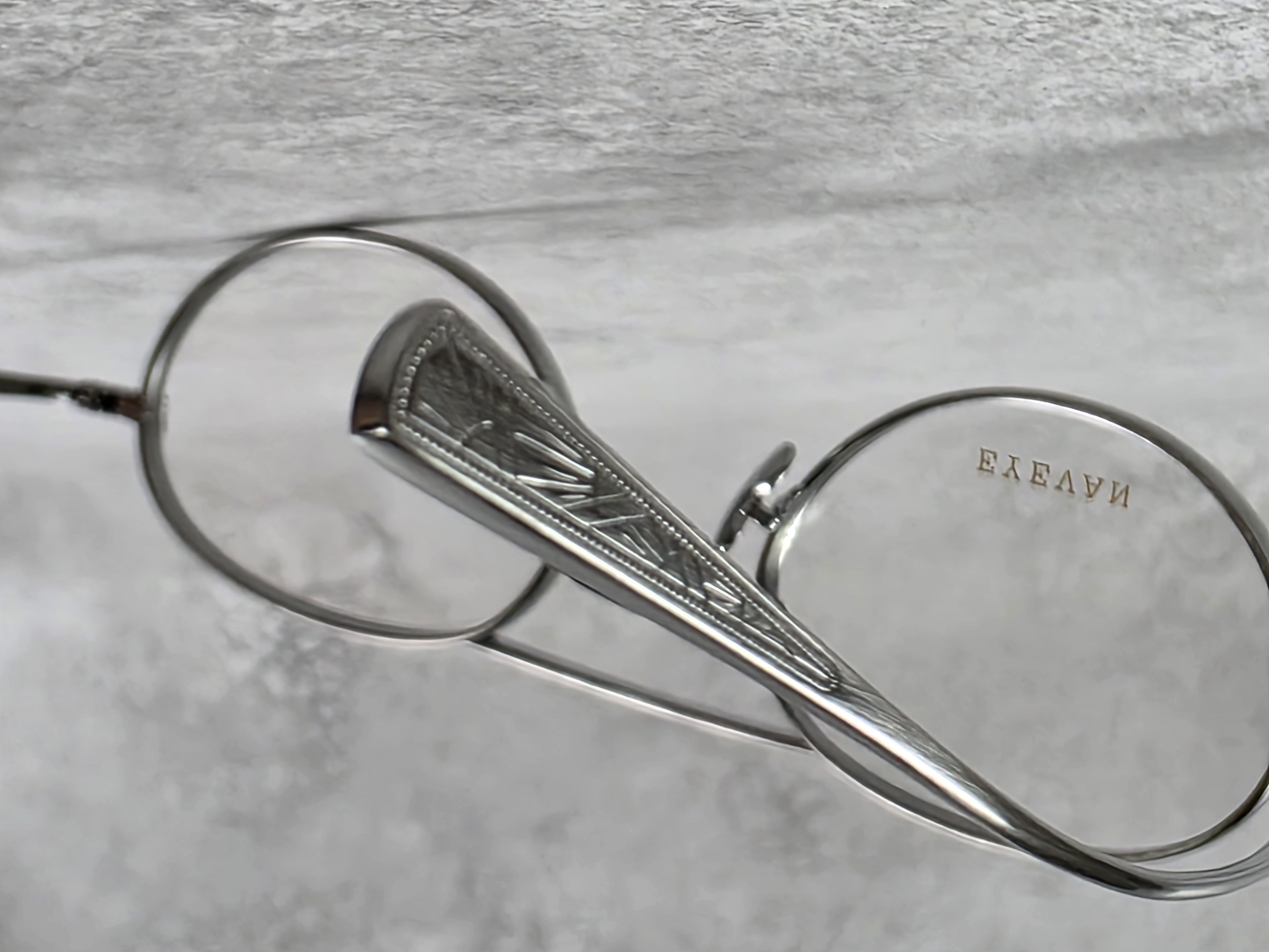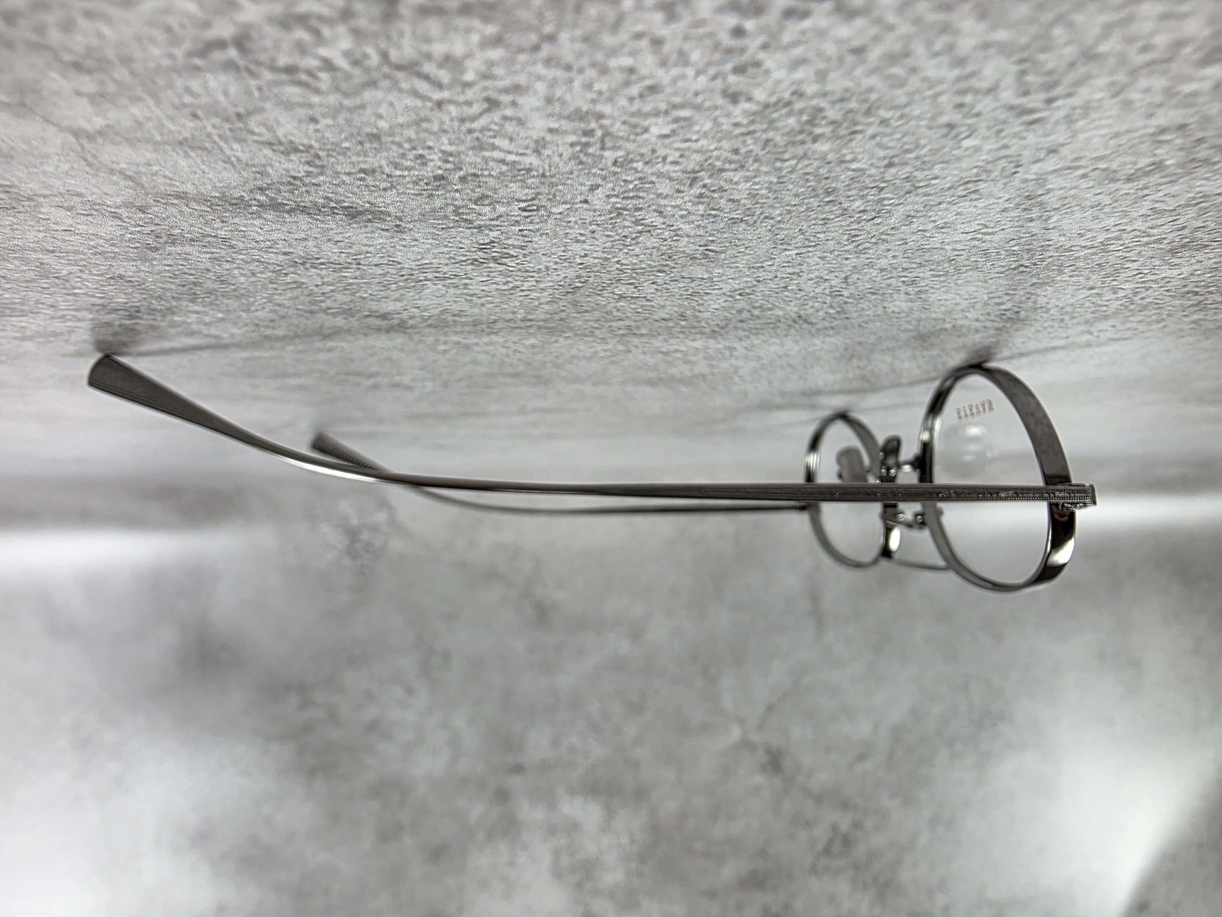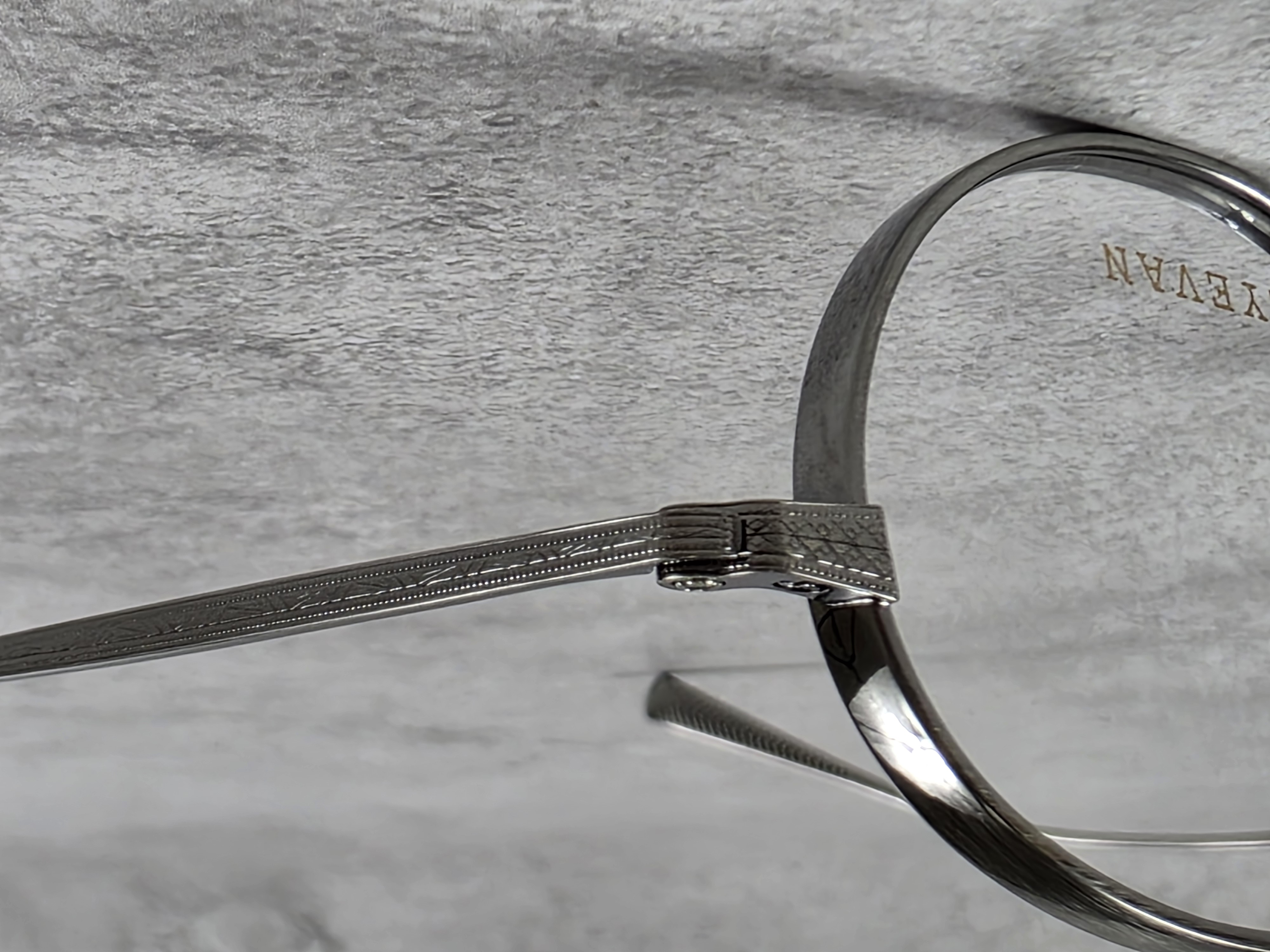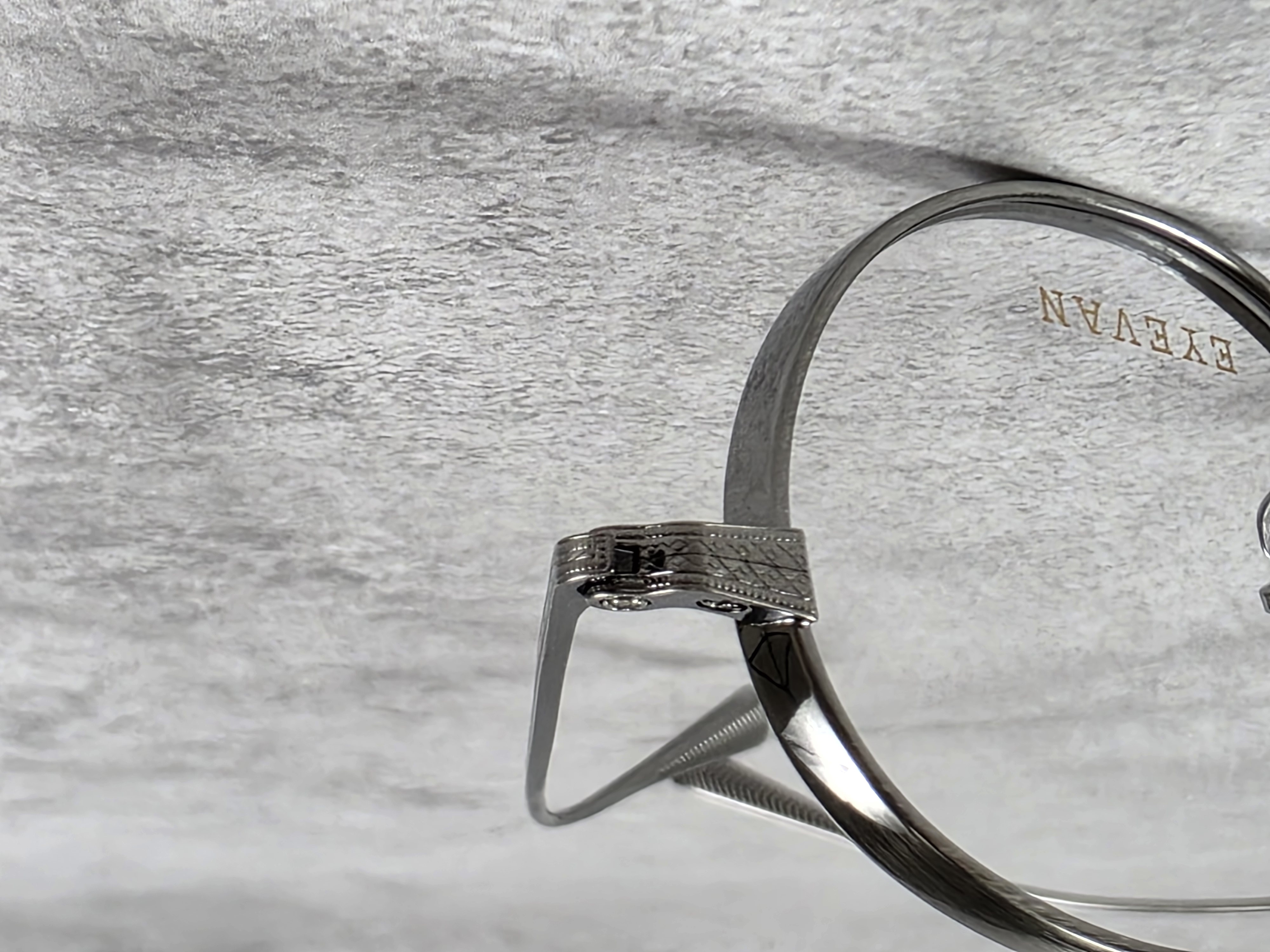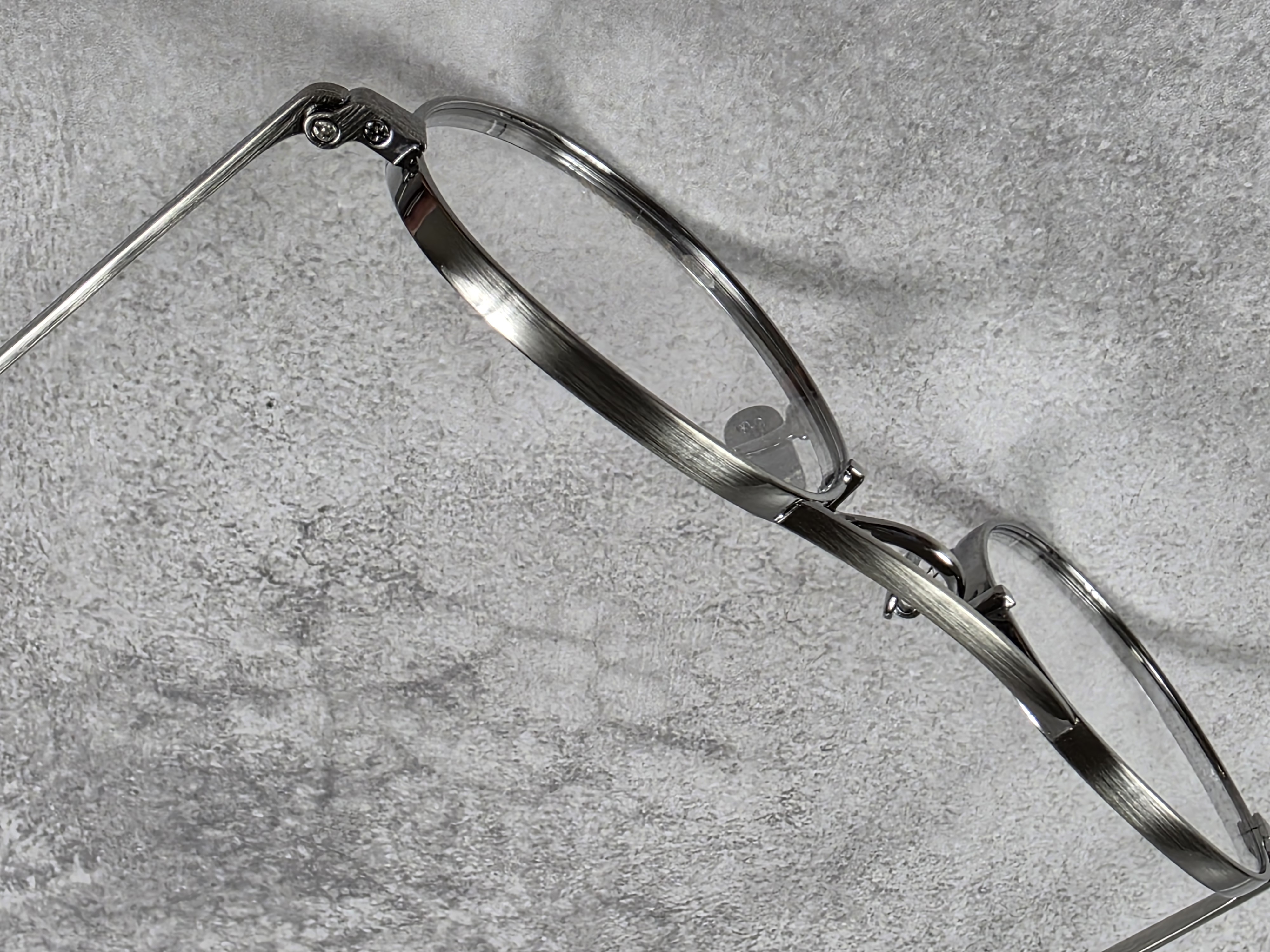 わずかに厚みをもたせたオリジナルリムに、丁番の内側にまで装飾が施された職人の手掘りマスターによるヨロイ、そして繊細な模様を刻んだチタンテンプルを組み合わせ、柔らかな曲線を描くブリッジで全体をまとめている。