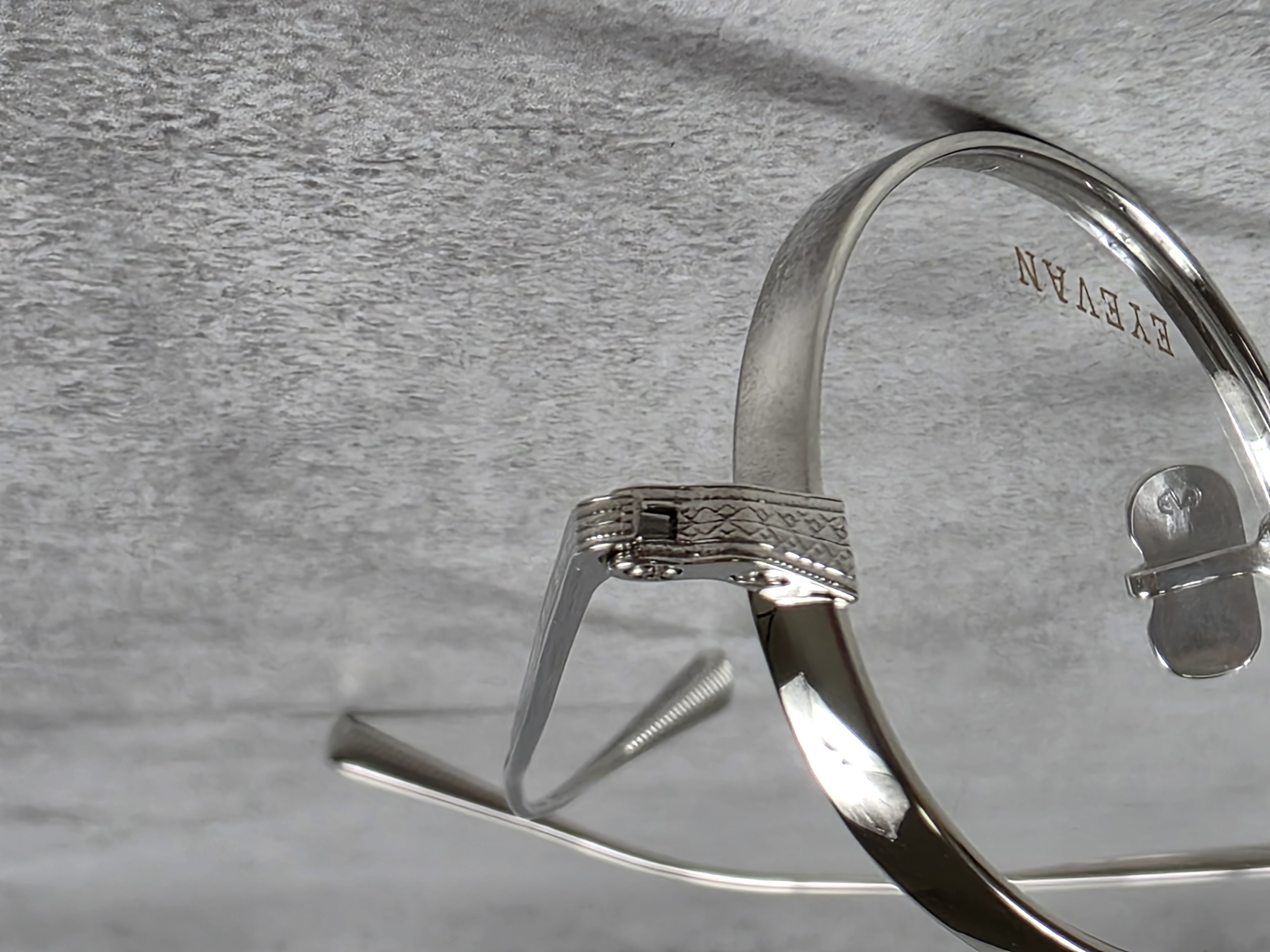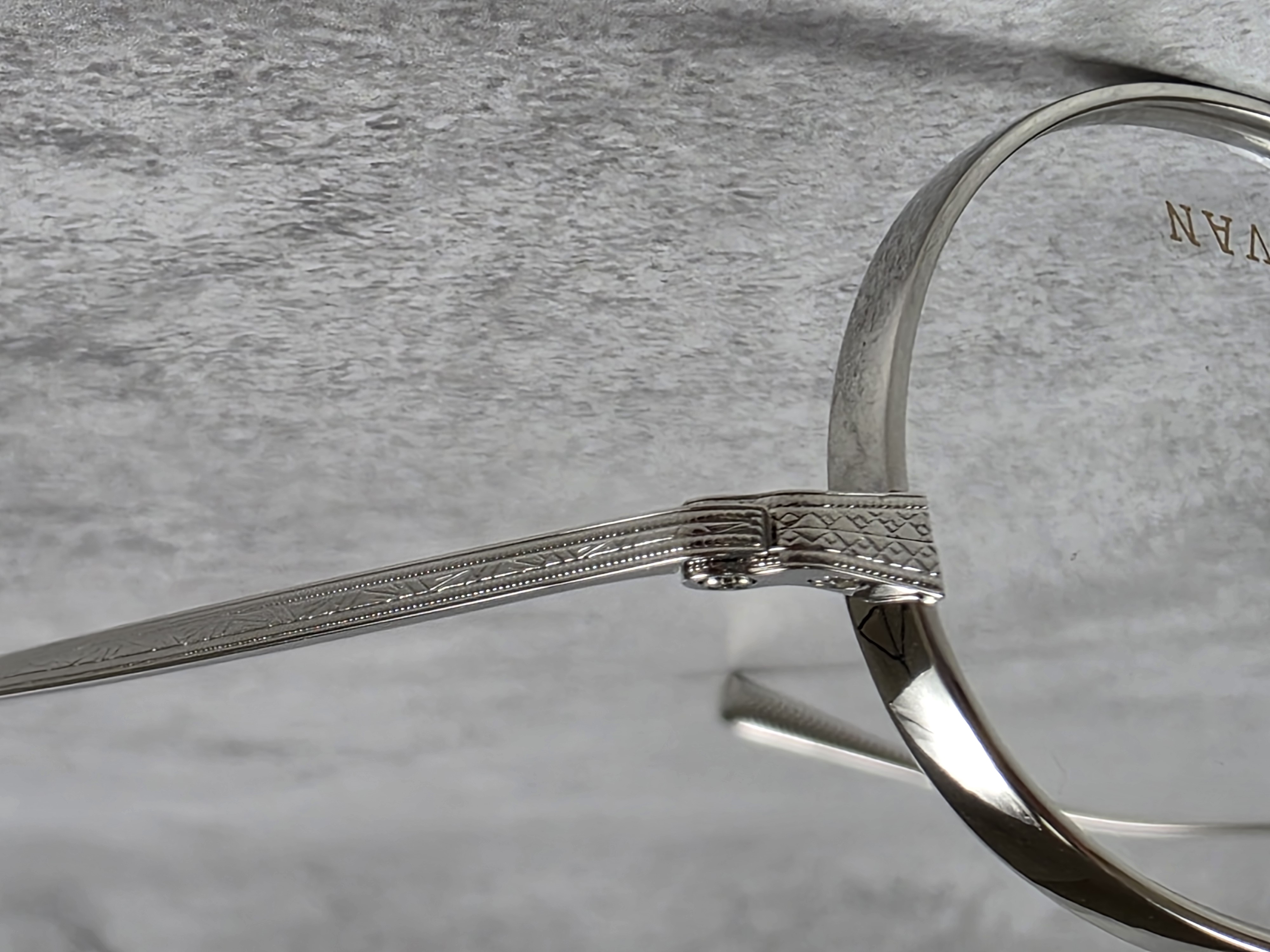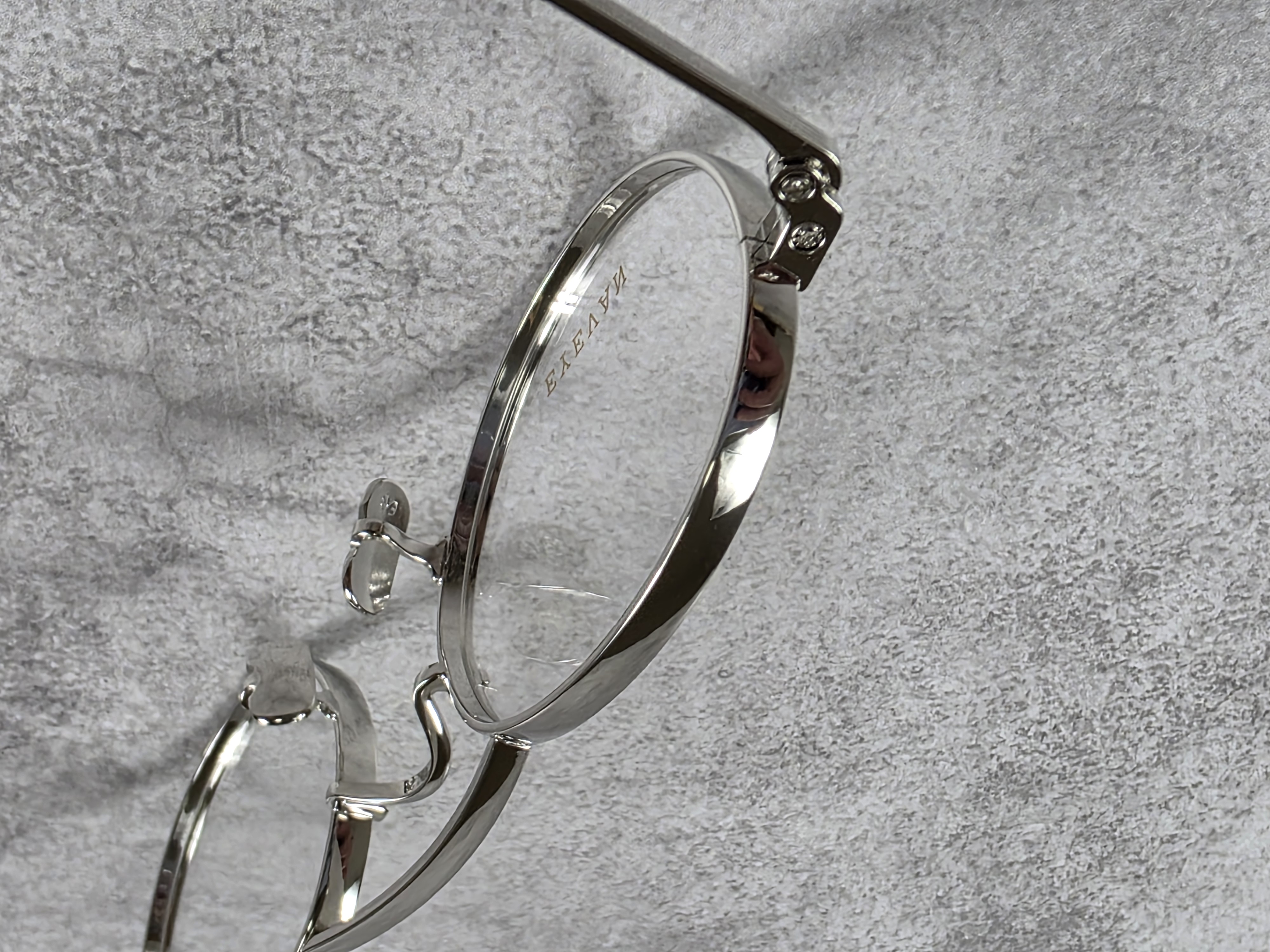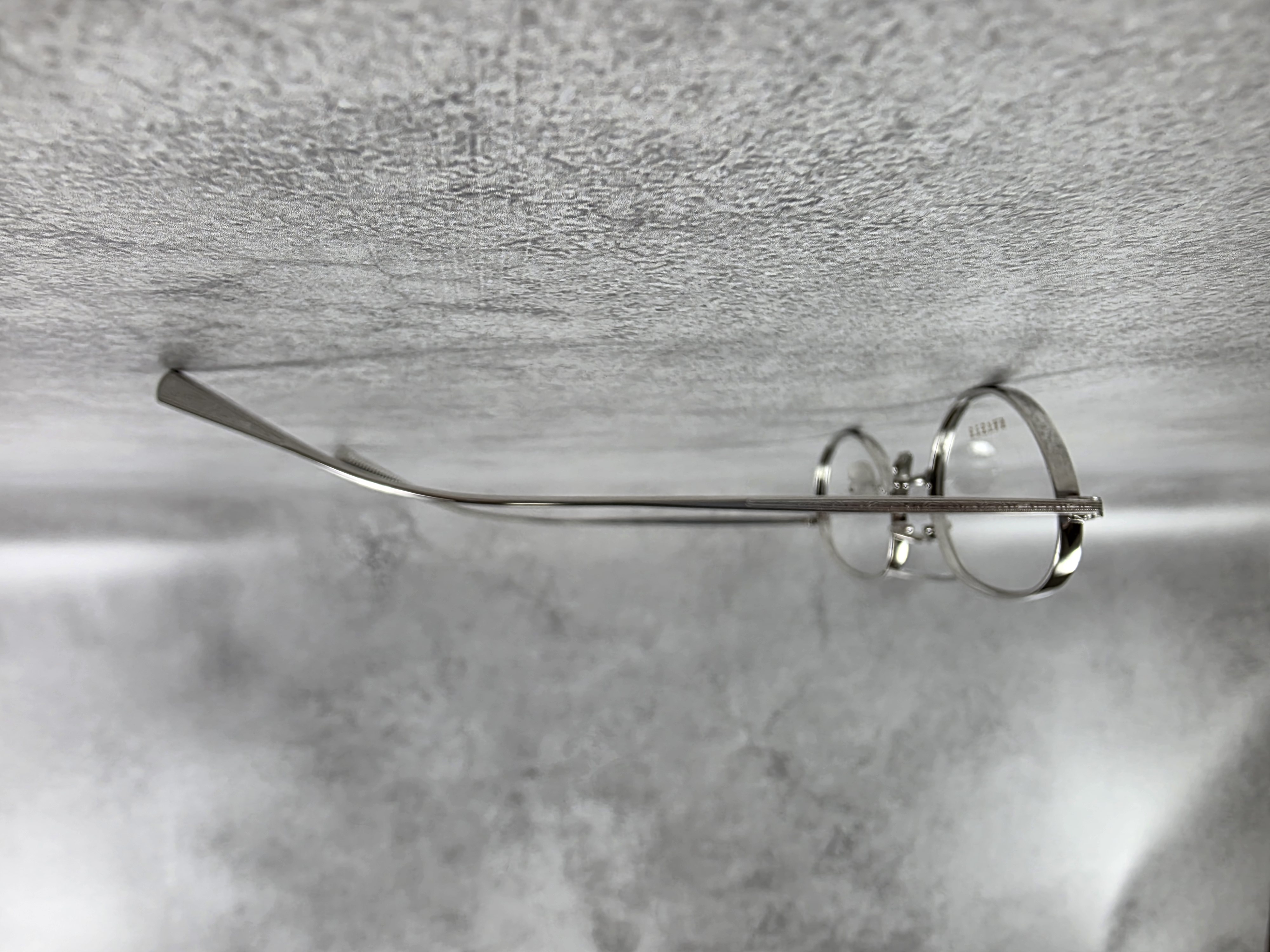 わずかに厚みをもたせたオリジナルリムに、丁番の内側にまで装飾が施された職人の手掘りマスターによるヨロイ、そして繊細な模様を刻んだチタンテンプルを組み合わせ、柔らかな曲線を描くブリッジで全体をまとめている。