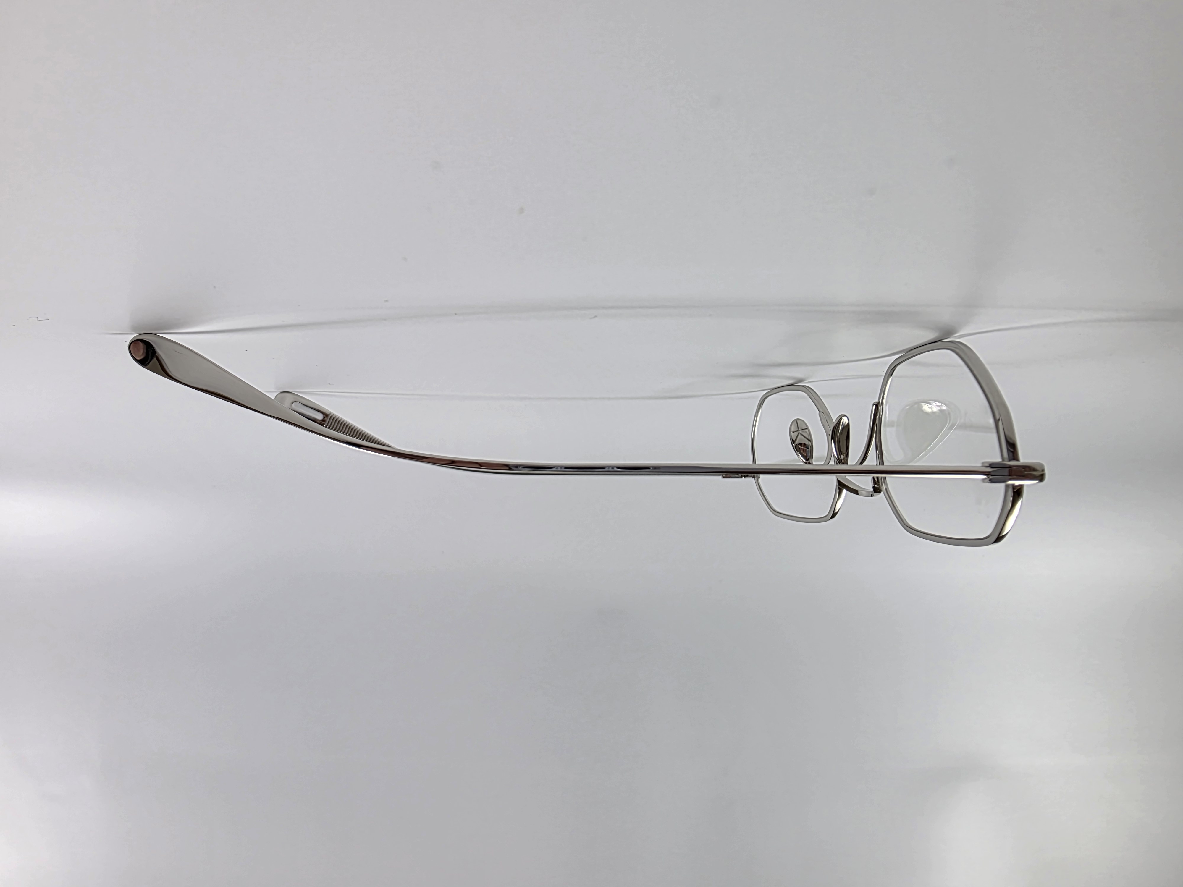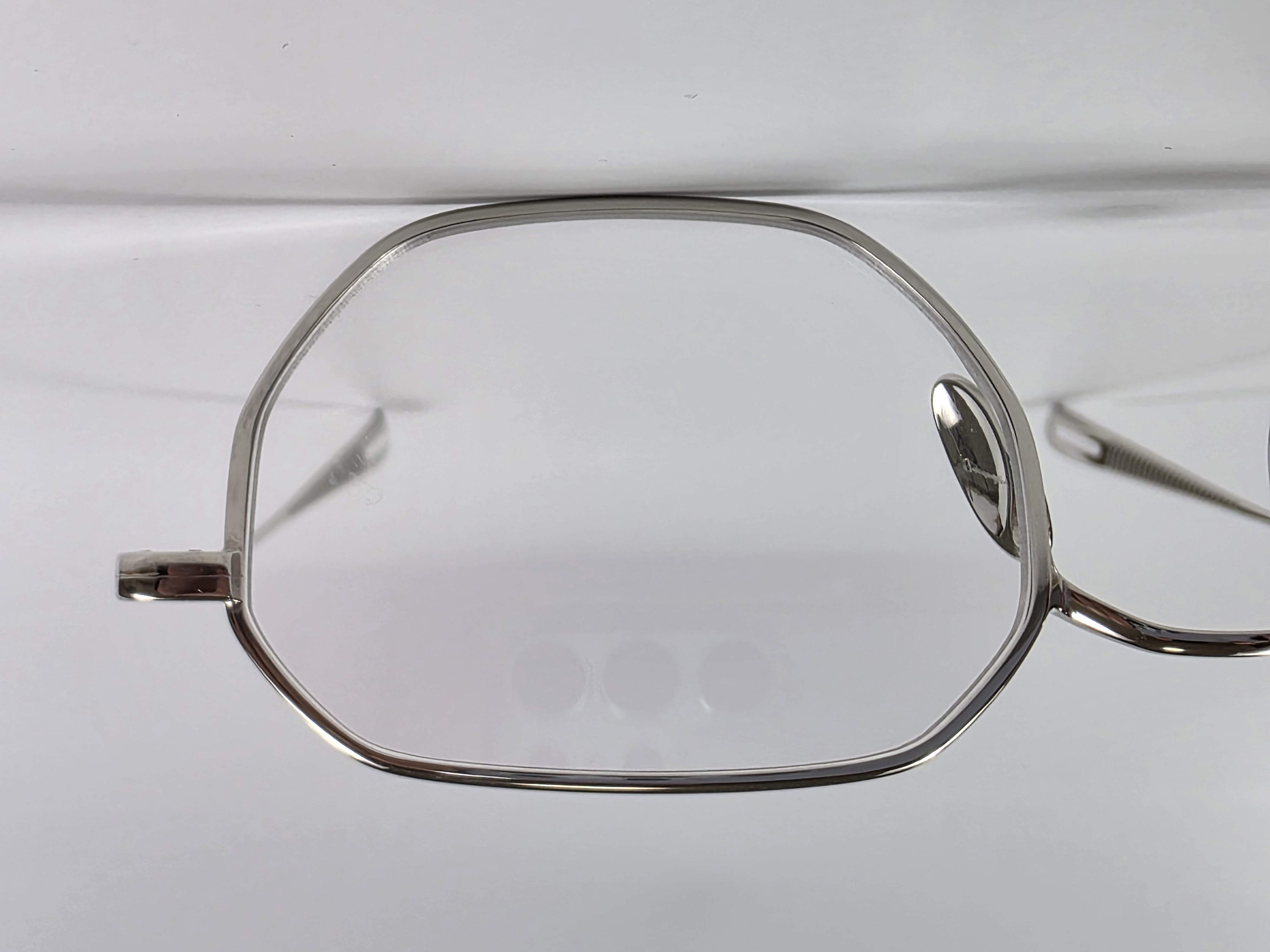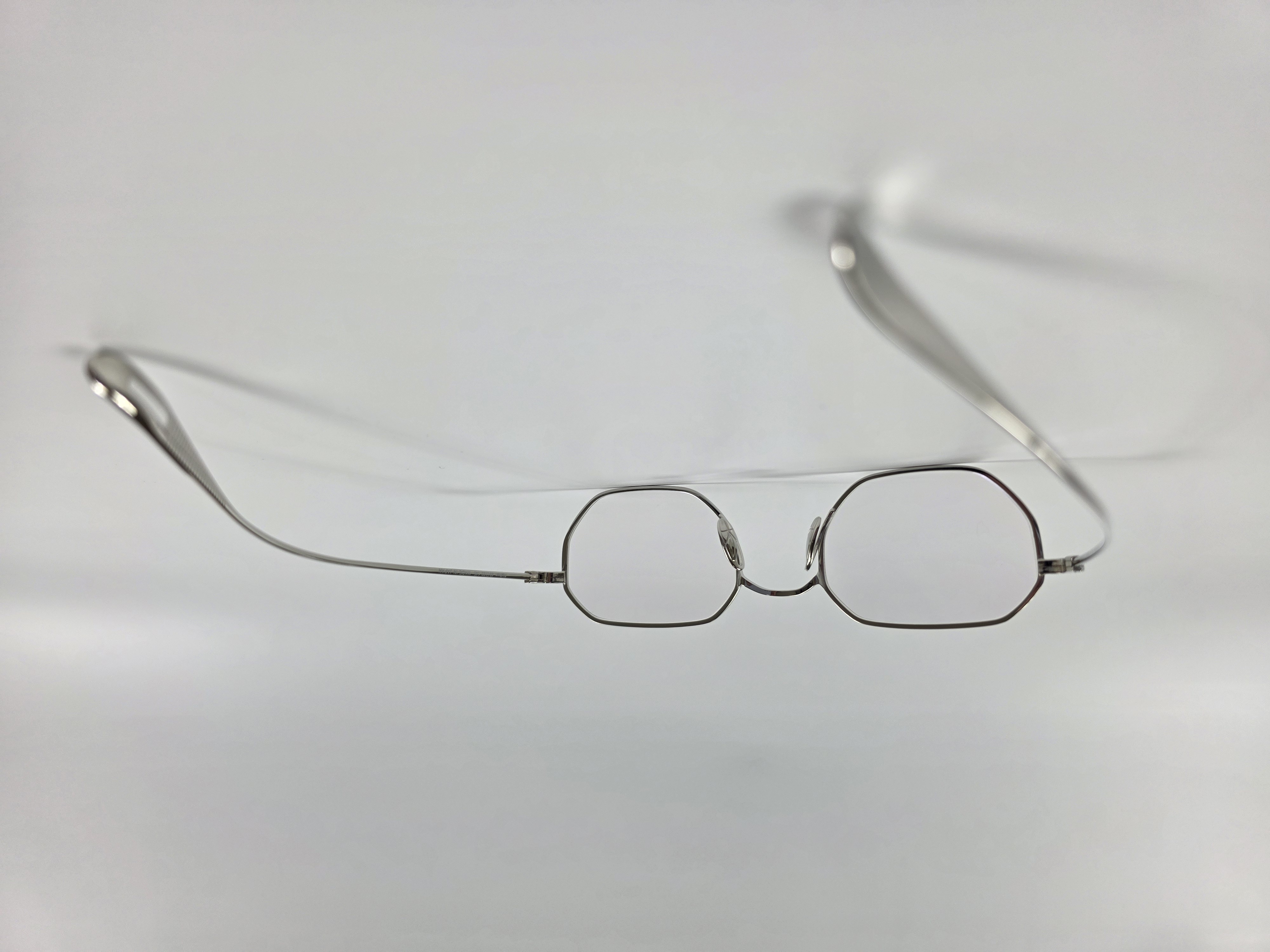 フロントからヨロイ、テンプルへと繋がる丸みと平面の組み合わせはチタン素材の持つ表情を引き出し、自然と顔に馴染む造形美を表現している。