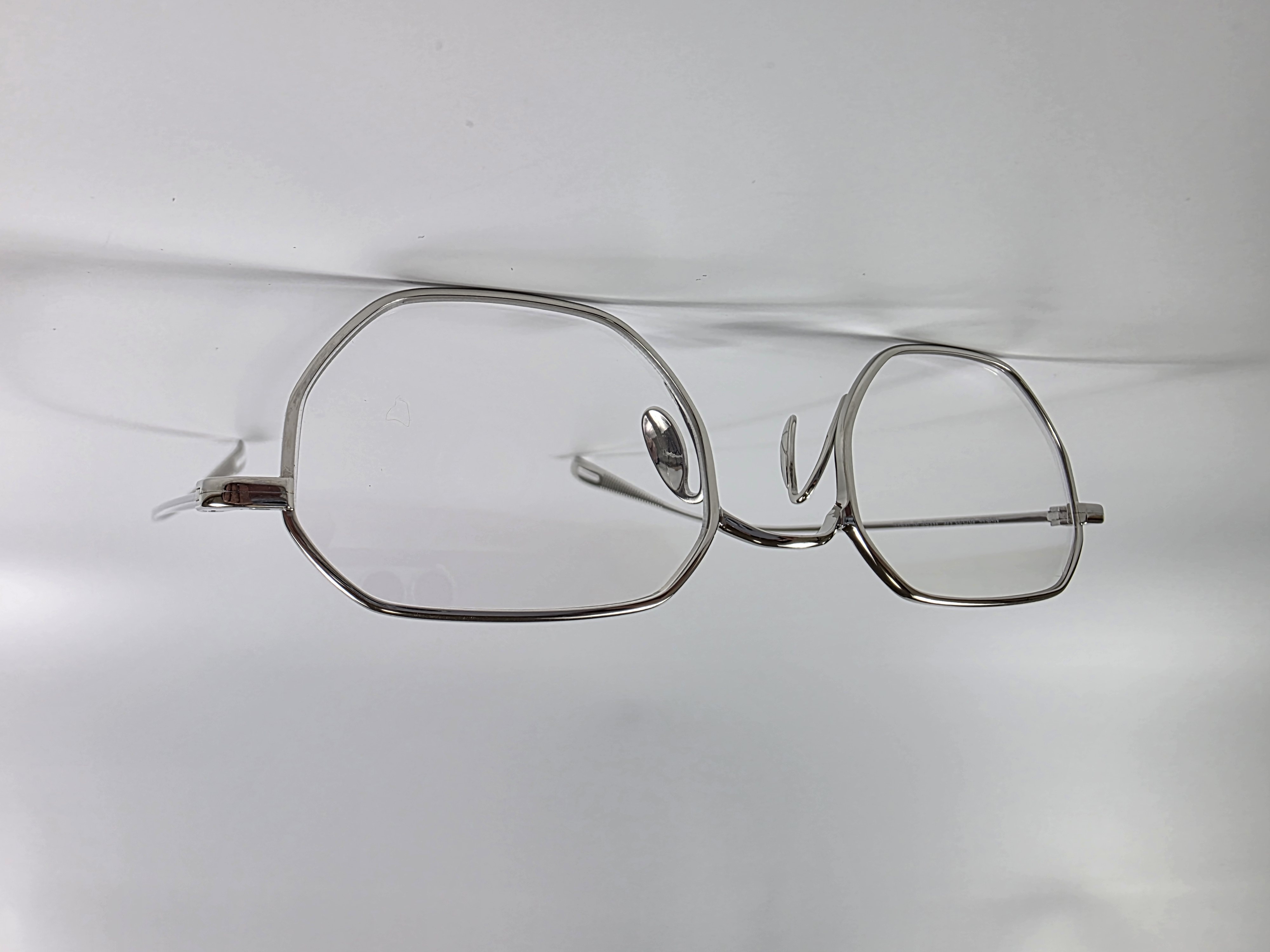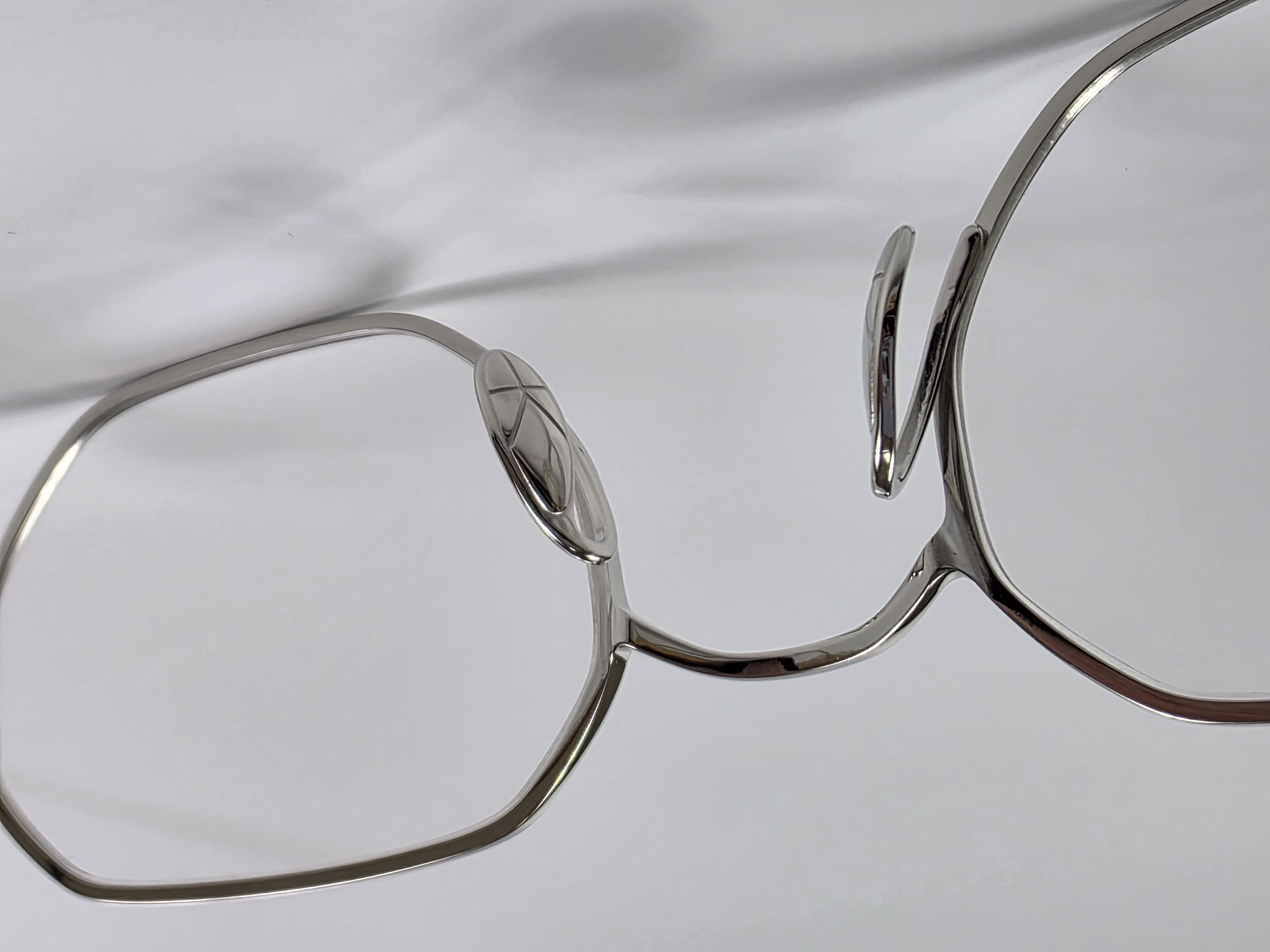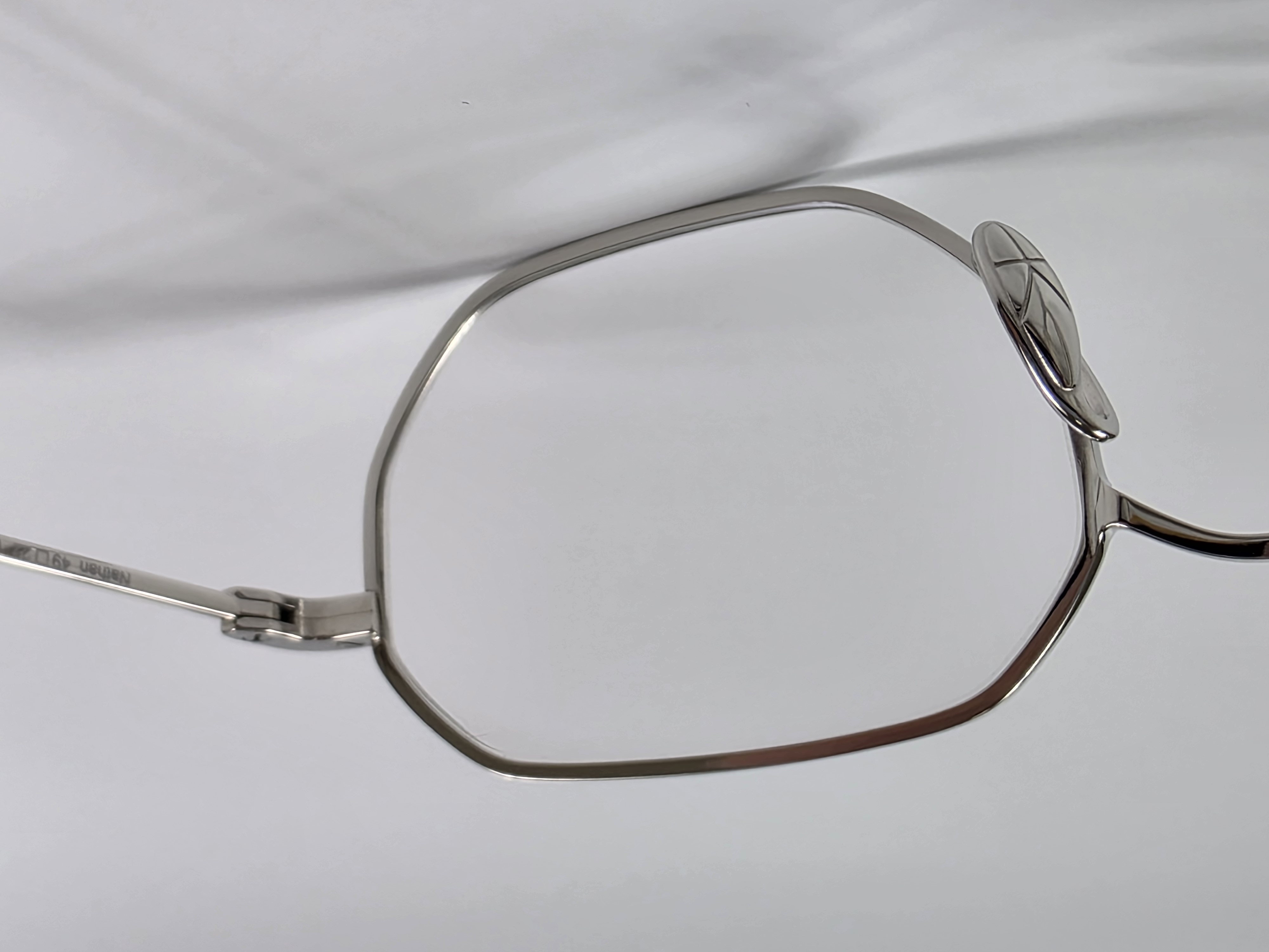 フロントからヨロイ、テンプルへと繋がる丸みと平面の組み合わせはチタン素材の持つ表情を引き出し、自然と顔に馴染む造形美を表現している。